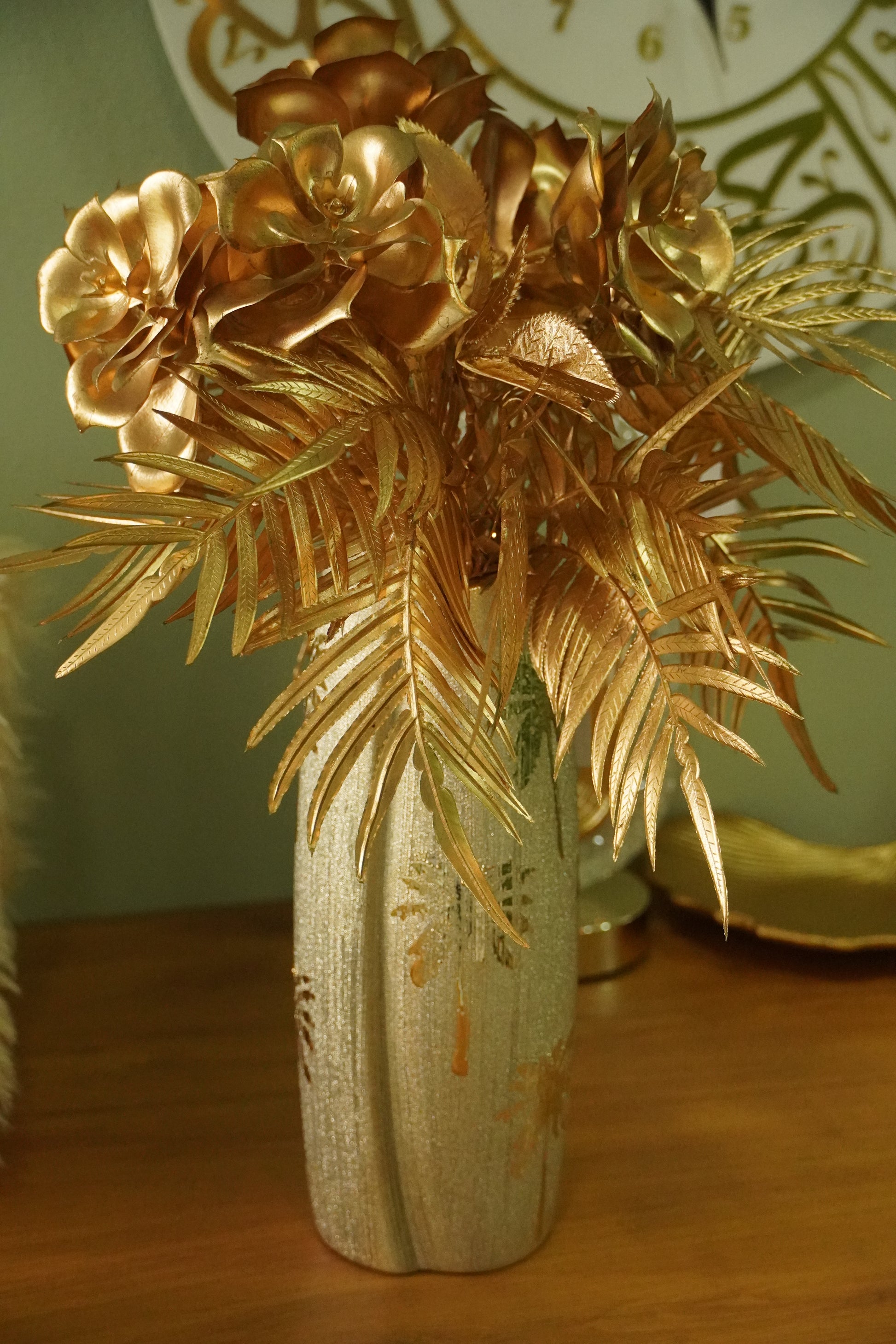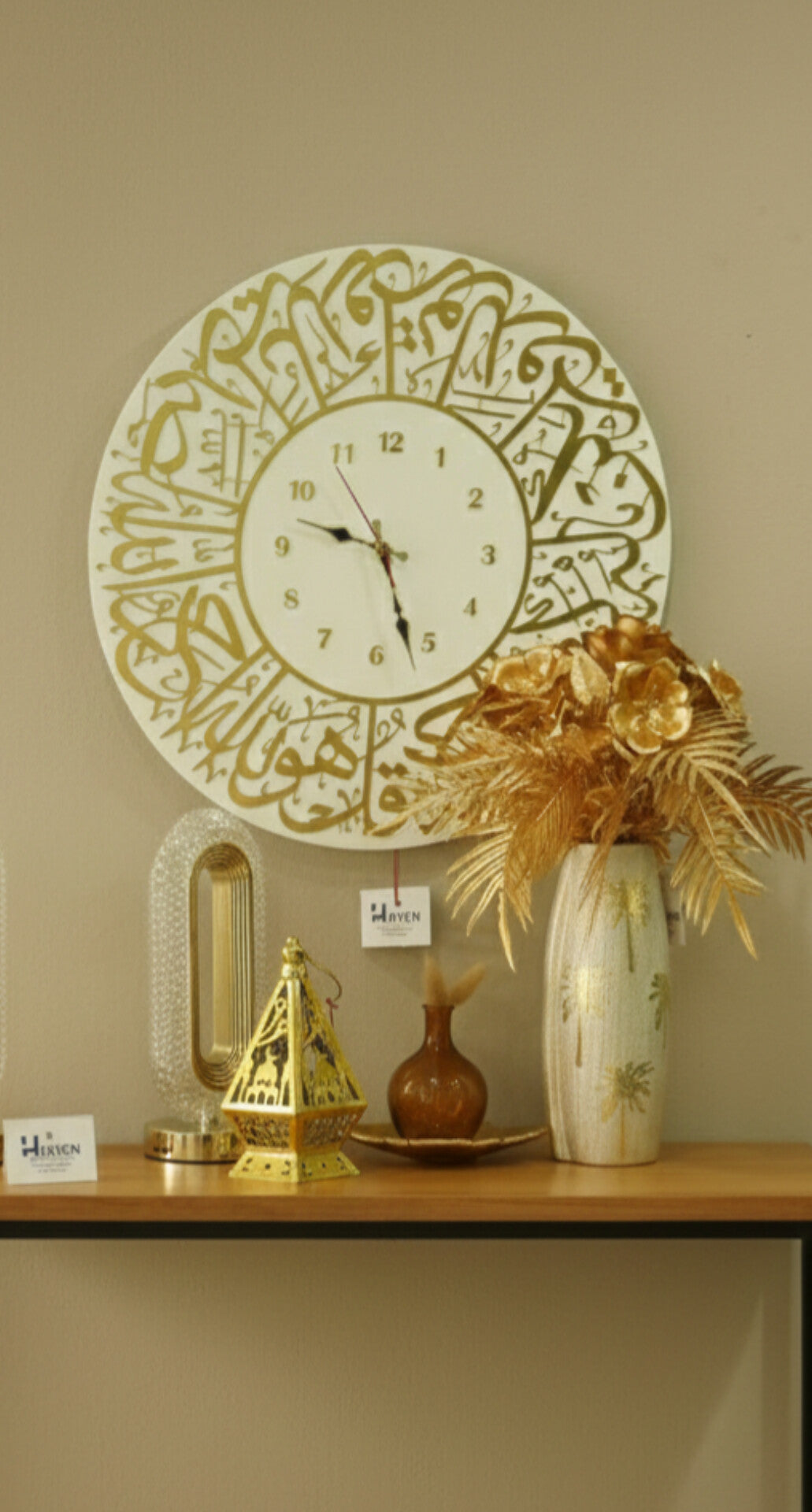 Luxury Islamic Home Decor Set | Calligraphy Wall Clock, Ceramic & Glass Vase, Wooden Leaf, Metal Lamp