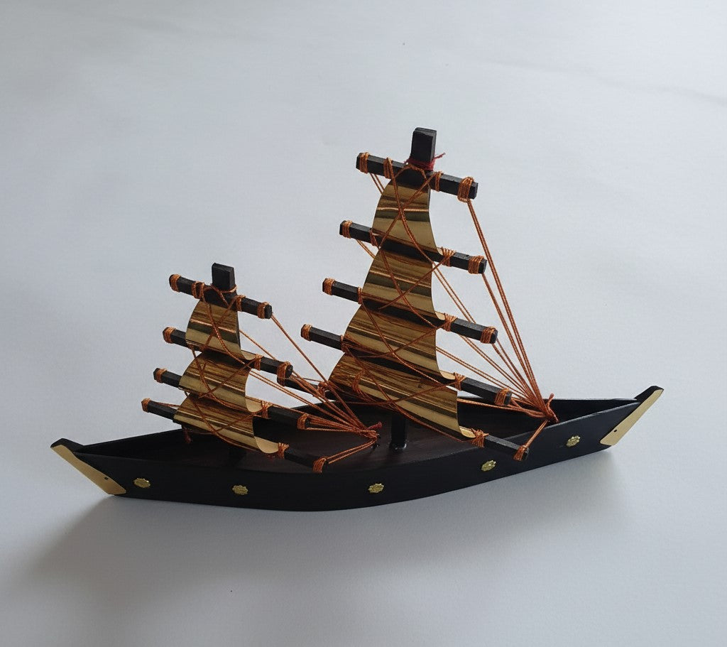 The set features a framed Islamic geometric wall art, a handcrafted metal leaf wall art piece that adds texture and depth, a premium ceramic vase with artificial white flowers, a classic decorative lantern (non-light, décor only), and an artistic wooden sailboat showpiece for a complete luxury look.