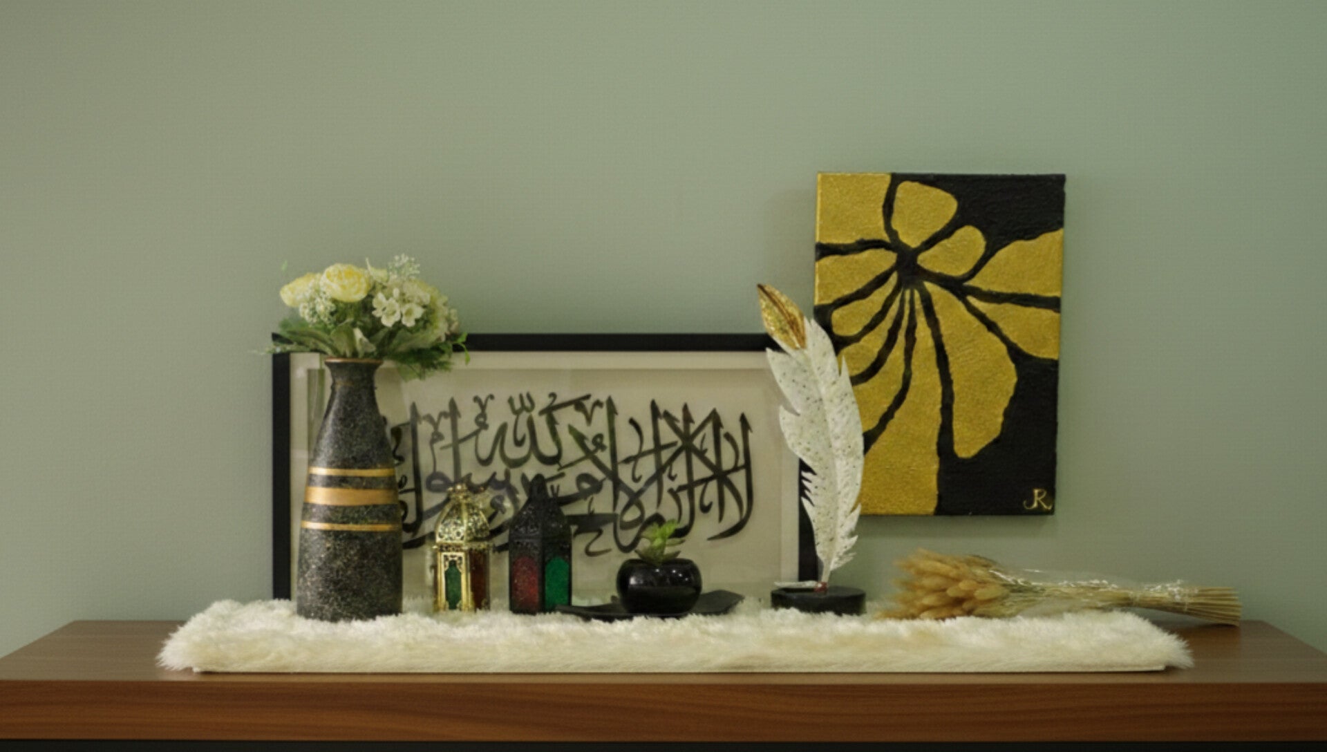 This thoughtfully arranged décor set features Arabic calligraphy wall art, lantern accents, floral and natural elements, creating a peaceful and meaningful display for the holy month. Perfect for console tables, shelves, or prayer areas, it adds depth and character to any space.